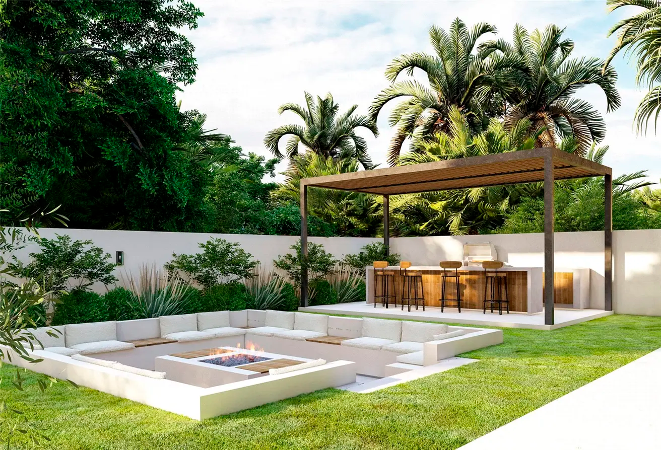 Die Villa verfügt über einen erfrischend angelegten Garten mit einem privaten Pool, einem versunkenen Sitzbereich und einer Pergola.